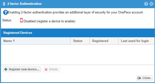 This window will display the current status of 2-factor authentication on your account and list your registered devices. To enable 2-factor authentication, you must register at least one device.