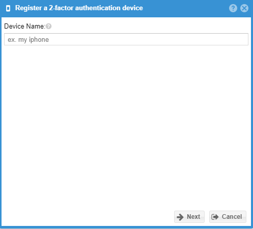 To register a new device click on the "Register new device..." button. You will be prompted to enter a name for your device. Choose something that will allow you to remember what device you are registering (e.g. "my iphone 7"). Then press "Next".