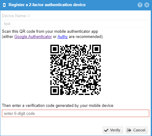 Enter a 6-digit passcode generated by your mobile device and click "Verify" to continue. At this point 2-factor authentication will be enabled for your account and you will be prompted to enter a passcode on your next login.