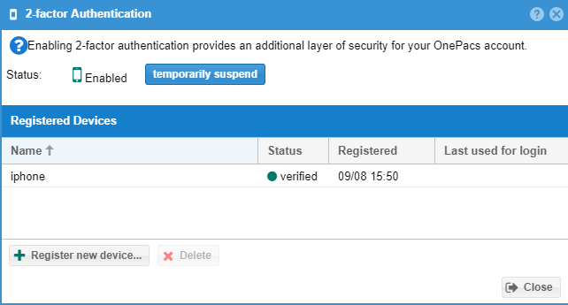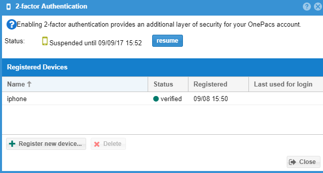 If 2-factor authentication is suspended, it can be re-enabled by clicking the "resume" button.