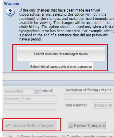 When "make changes" is selected the "Finalize" button will show as "Finalize With Changes". Submitting the report will show a warning and offer to submit for radiologist review or to submit with trivial typographical errors corrections.