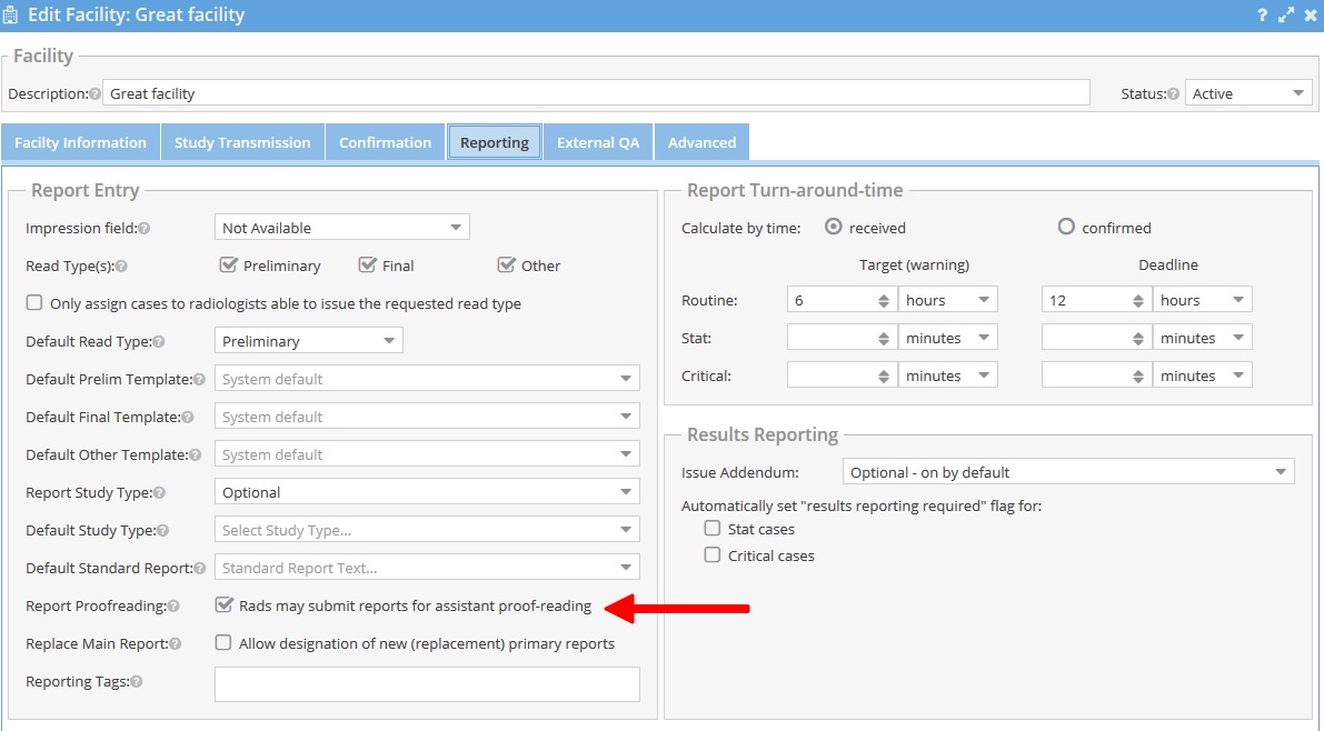 - An administrator can use the Admin -> Facilities menu and edit a facility by checking the "Rads may submit reports for assistant proof-reading" checkbox under the reporting tab.